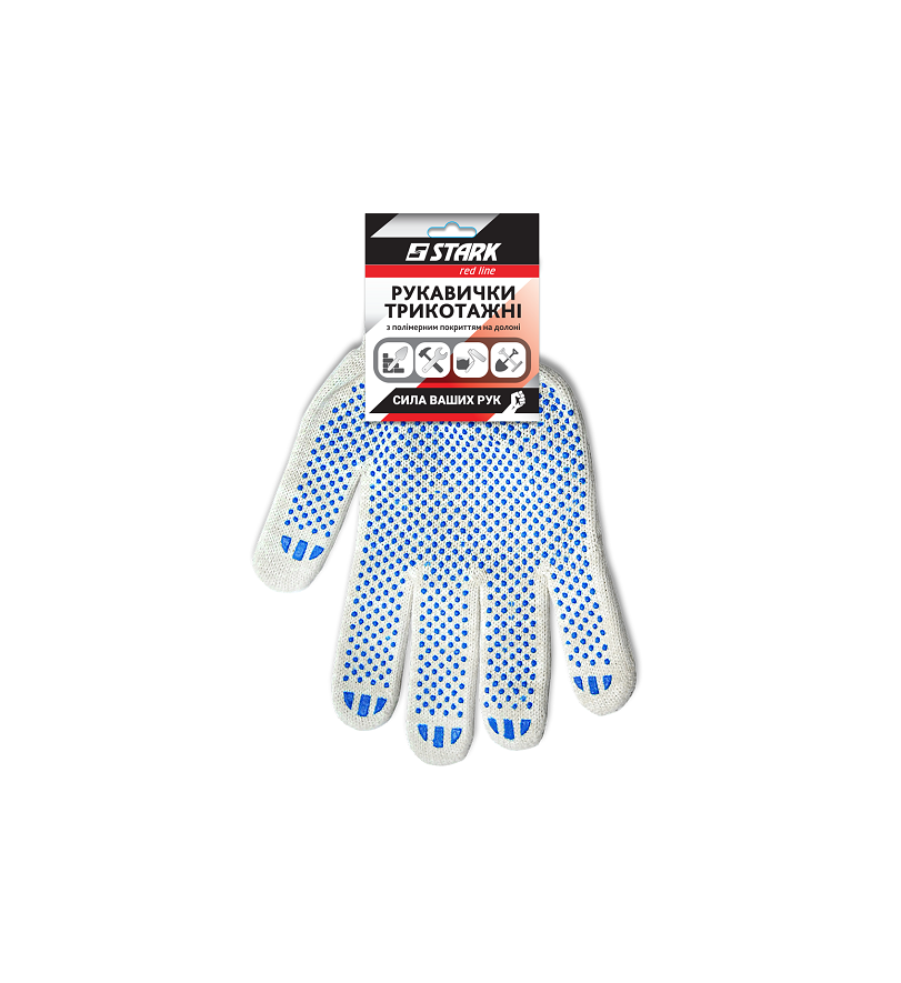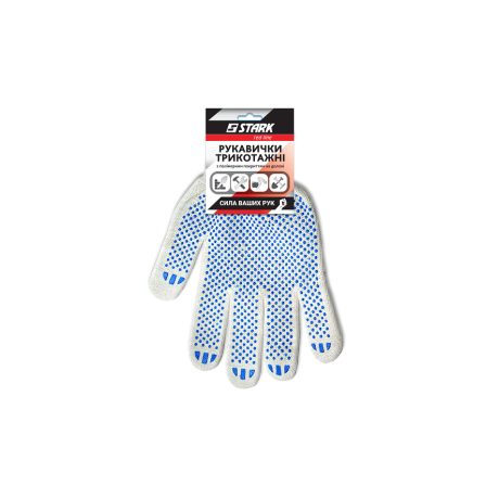Stark White 4 нитки - перчатки с ПВХ покрытием для защиты рук при выполнении различных механических работ при строительных, малярных, ремонтных работах. Изготовлены вязанием из 4 нитей на 70% хлопок и на 30% полиэстер. Манжет перчатки на резинке, которая удобно фиксируется на руке. Для предотвращения скольжения на рабочую поверхность нанесены ПВХ точки. Плотность 180 текс обеспечит длительный срок службы перчатки. Класс вязания 10 - означает, что перчатки будут плотно сидеть на руке, не пропуская, при случае, большое количество грязи.Преимущества и гарантия