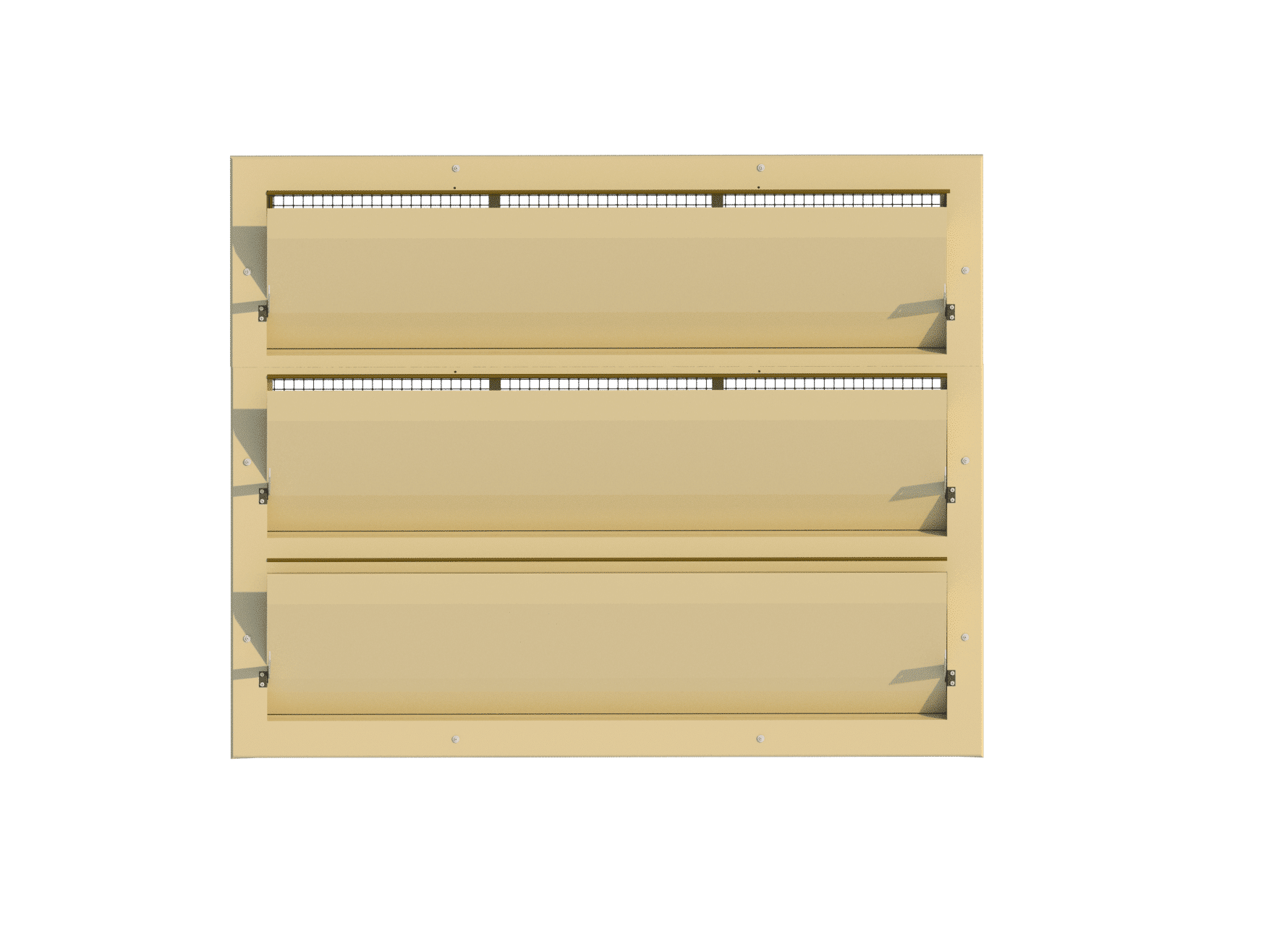Туннельный приточный блок, состоящий из 1 x 6000-VFR-T + 1 x 6000-VFR-M + 1 x 6000-VFR-B. Настенное исполнение, фланец спереди, прямые внутренние заслонки. Управление осуществляется двумя боковыми отводами из нержавеющей стали на каждое приточное отверстие. Монтажные размеры 1520*1220 мм, полезная глубина 135 мм. Производительность по воздуху 17400 м³/ч при 10 Па.Преимущества и гарантия