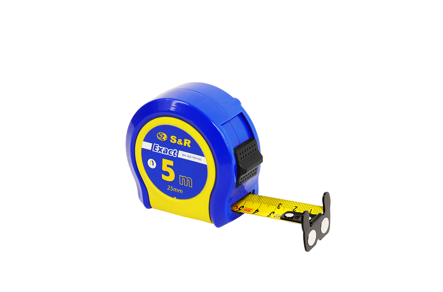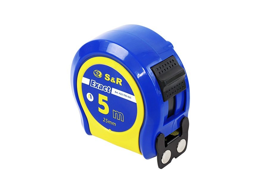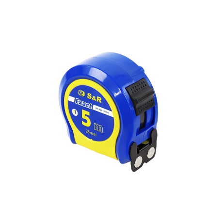 S & R Exact 5x25 мм - ручна рулетка для зняття замірів для ремонту, монтажу, виробництва. Розмітка на вимірювальної стрічці нанесена по обидва боки для зручного використання в різних умовах. Вимірювальна стрічка з якісним захисним покриттям, яке захищає позначки на стрічці від стирання, а також зміцнює стрічку не дозволяючи гнуться. Якісний механізм для скручування, забезпечує довгу роботу інструменту. Зручний фіксатор, дозволяє зафіксувати стрічку в будь-якому положенні. Корпус рулетки стійкий до ударів і падінь, а також не ковзає в руках. На стрічці магнітний гачок, який легко кріпиться до металевих поверхонь, що значно спрощує роботу. Має другий клас точності, що доводить високий рівень інструменту.Переваги та гарантія