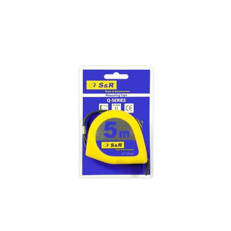 S & R Q-series 5 Мx 25 мм - ручна рулетка для зняття замірів на будівельному об'єкті, в ремонтних цілях, для виробництва. Вимірювальна стрічка з захисним покриттям, яке захищає стрічку від стирання. Якісний механізм скручування стрічки забезпечує точну роботу без заломів стрічки. Клас точності - II. На кінці стрічка обладнана гумовим гачком, який можна зафіксувати як на круглої, так і на плоскій поверхні. Прогумований корпус рулетки забезпечує не тільки комфортну роботу з інструментом, але запобігає ковзанню і забезпечує протиударний ефект.Переваги та гарантія