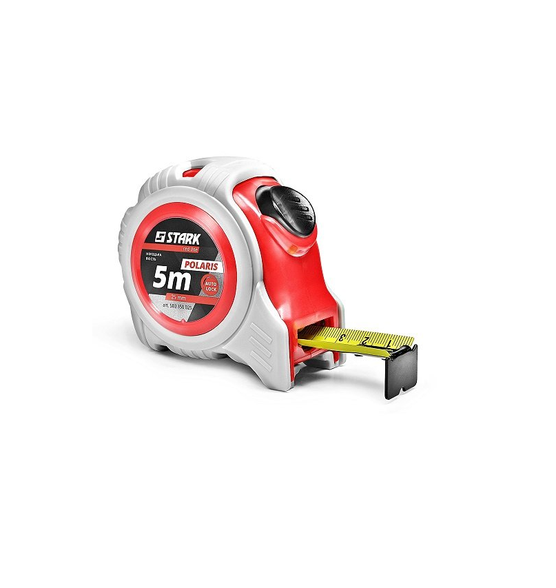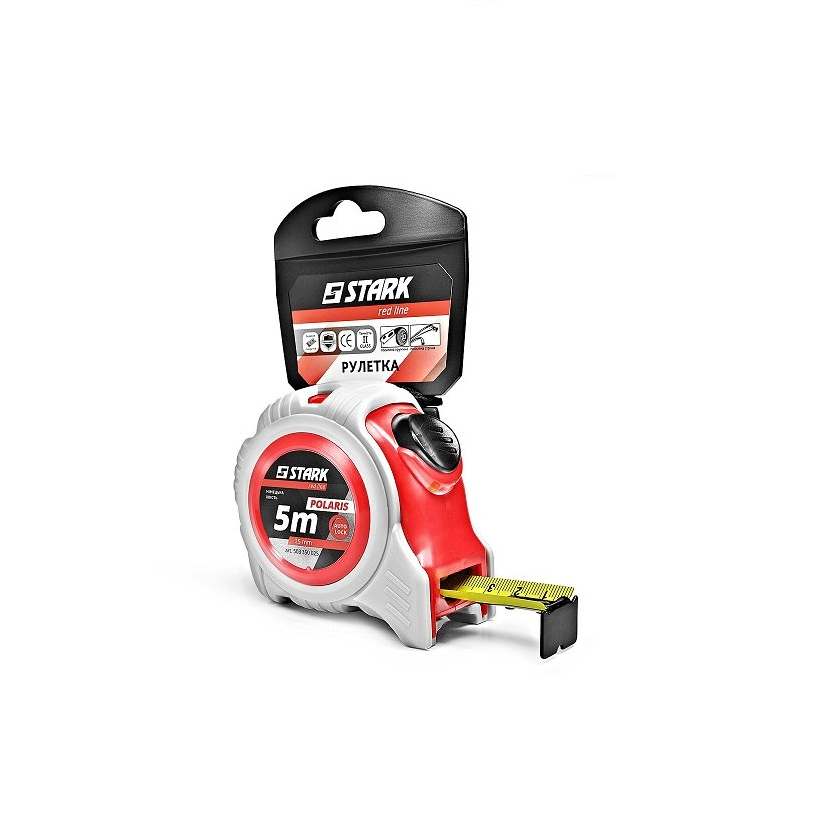 Stark Polaris 5x25 - ручна рулетка для зняття замірів для ремонту, монтажу, виробництва. Рулетка обладнана кнопкою автостопу, яка дозволяє швидко і чітко зафіксувати відміряють довжину. Якісна стрічка з посиленим захисним покриттям - міцна в висунутому стані і еластична при скручуванні, що не витираються розмітки. Стрічка регулюється за допомогою надійної пружини, яка дасть можливість рулетці служити Вам довгі роки. Має другий клас точності, що доводить високий рівень інструменту. Корпус рулетки виготовлений з міцного матеріалу з прогумованими вставками, що забезпечує надійне захоплення без ковзання. На задній частині корпусу гачок, завдяки якому рулетка буде завжди у Вас під рукою.Переваги та гарантія