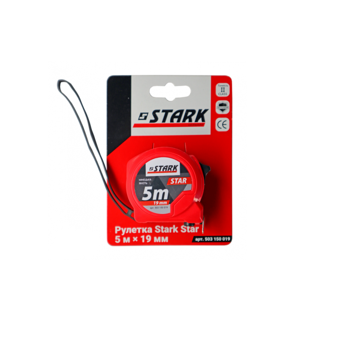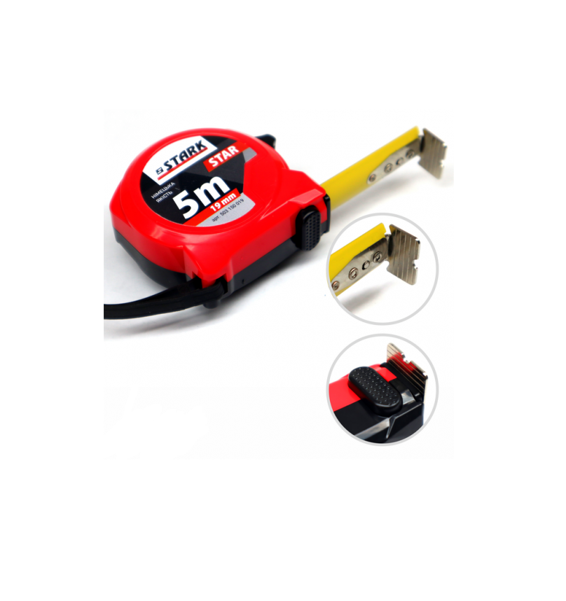 Stark Star 5x19 - ручна рулетка для зняття замірів для ремонту, монтажу, виробництва. Якісна стрічка з посиленим захисним покриттям - міцна в висунутому стані і еластична при скручуванні, що не витираються розмітки. Надійне подвійне фіксування стрічки зверху і знизу, забезпечить безпечне і точне вимірювання. Стрічка регулюється за допомогою надійної пружини, яка дасть можливість рулетці служити Вам довгі роки. Корпус рулетки виготовлений з міцного матеріалу з прогумованими вставками, що забезпечує надійне захоплення без ковзання. Має другий клас точності, що доводить високий рівень інструменту.Переваги та гарантія