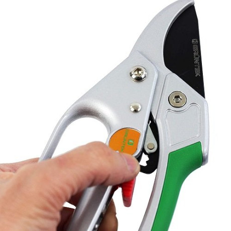 Gruntek Kondor 200 мм - секатор для зрізання гілок з кущів, з виноградника, з дерев, а також для догляду за квітковими клумбами. Леза виготовлені з ввисокоуглеродістой стали SK5, а для швидкої і якісної роботи верхнє лезо покрите шаром від налипання. Завдяки наковаленкою секатором можна обробляти міцні гілки. 2-х режимний храповий механізм з автоматичним перемиканням дозволяє різати як дрібні гілки, так і товсті сухі гілки з меншим зусиллям. Рукоятки з алюмінієвого сплаву з м'якою накладкою забезпечують комфортну роботу з секатором. Одна з рукояток D-подібної форми для зручного захоплення інструменту. Підходить для роботи і правою, і лівою рукою. Секатор Kondor 200 мм комплектується губкою і точила, які дозволяють підтримувати леза гострими і чистими. Секатор Gruntek Kondor 200 мм - створений для того, що б Ви отримували задоволення від догляду за своїм садом.Переваги та гарантія