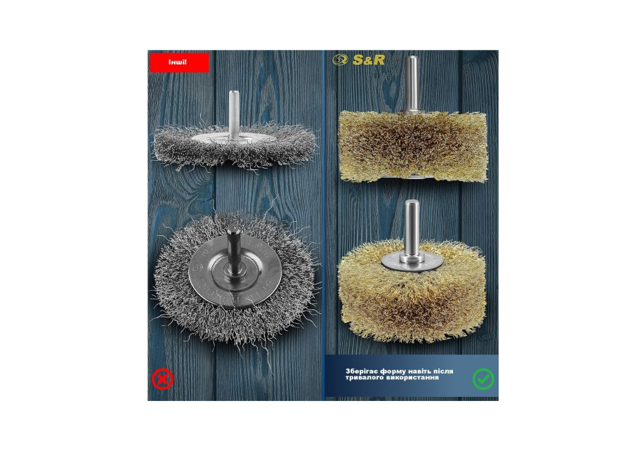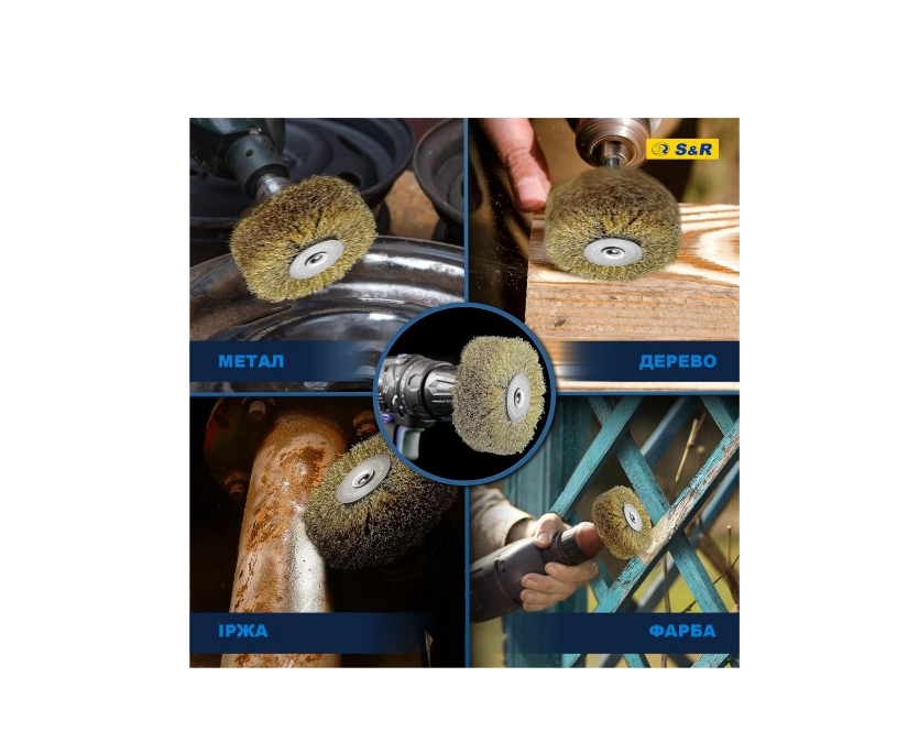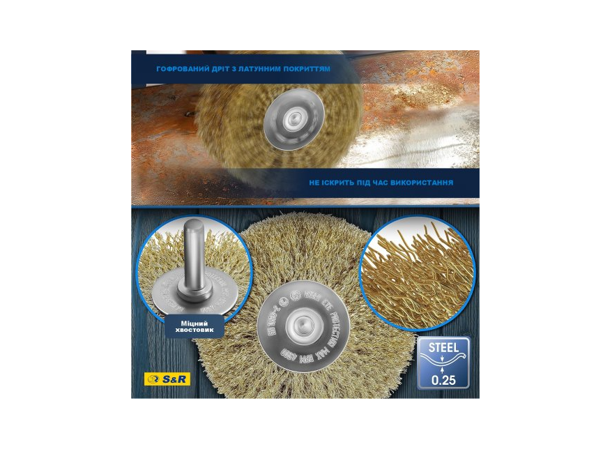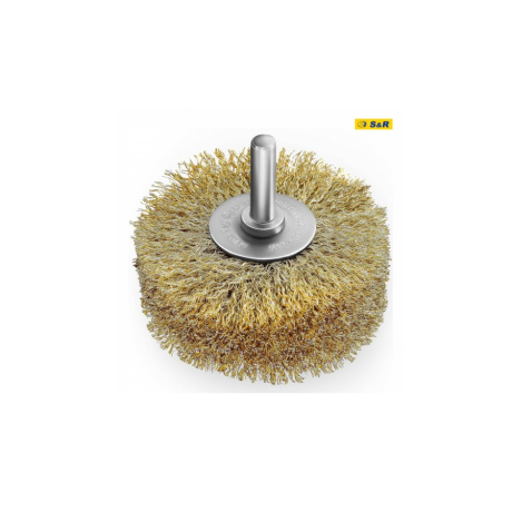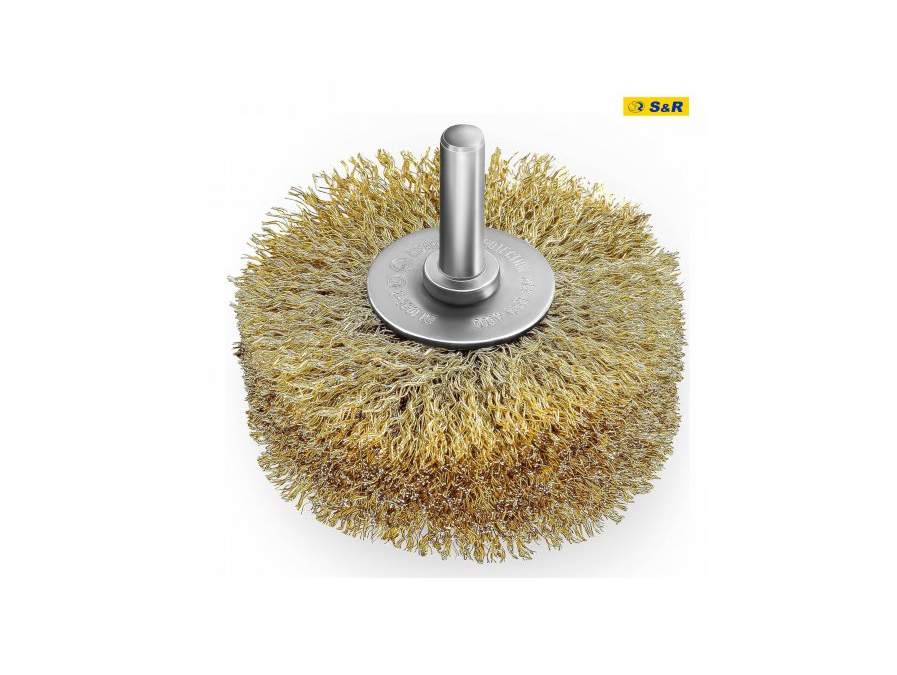 Щітка дискова S&R 80 x 35 мм з латунним покриттям – призначена для очищення металевих поверхонь від лакофарбових покриттів, для видалення іржі, структурування дерев'яних поверхонь і т.п. Особливості дискової щітки СР 80х35 мм: Щетинки щітки виготовлені із сталевого дроту діаметром 0,25 мм, мають латунне покриття. Завдяки такому покриттю під час роботи з металевими заготовками зменшується кількість іскор. Круглий хвостовик діаметром 8 мм дозволяє встановлювати цю щітку в будь-який дриль/шуруповерт. Рекомендується використання зі швидкістю не більше 4500 об/хв. Габарити щітки: діаметр – 80 мм, товщина – 35 мм. Країна бренду: Німеччина.Переваги та гарантія