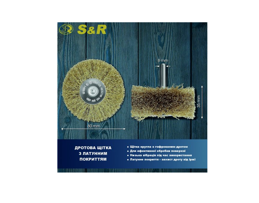 Характеристики Щітка дискова 80 x 35 мм, хвост.8 мм, d0,25 мм, об/хв 4500, вита латуна S&R (135080035)