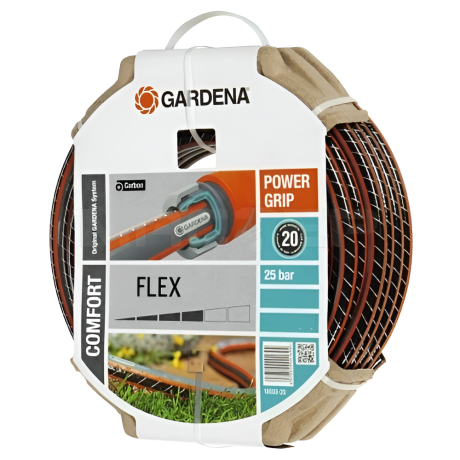 Gardena Flex 13 мм х 50 м - шланг з профілем Power Grip для поливу і подачі води для інших цілей. Профіль Power Grip це унікальне ребристе покриття, яке допомагає легко і швидко з'єднати шланг з іншими елементами базової системи поливу, а також потовщені стінки подовжують термін служби. Шланг можна спокійно залишати на вулиці, так як він стійкий до ультрафіолетових променів і виготовлений з ПВХ зі спіральним армуванням, ще й посилений вуглецевими нитками. Витримує тиск до 25 бар. Прекрасний предмет для подачі води з підвищеною гнучкістю і стійкістю до перегинів. З шлангом Gardena Flex 13 мм х 50 м, Вам більше не потрібно носити важкі відра, поливати клумби з лійки, просто підключіть шланг до крана або до системи поливу і Ваші цілі будуть задоволені.Переваги та гарантія