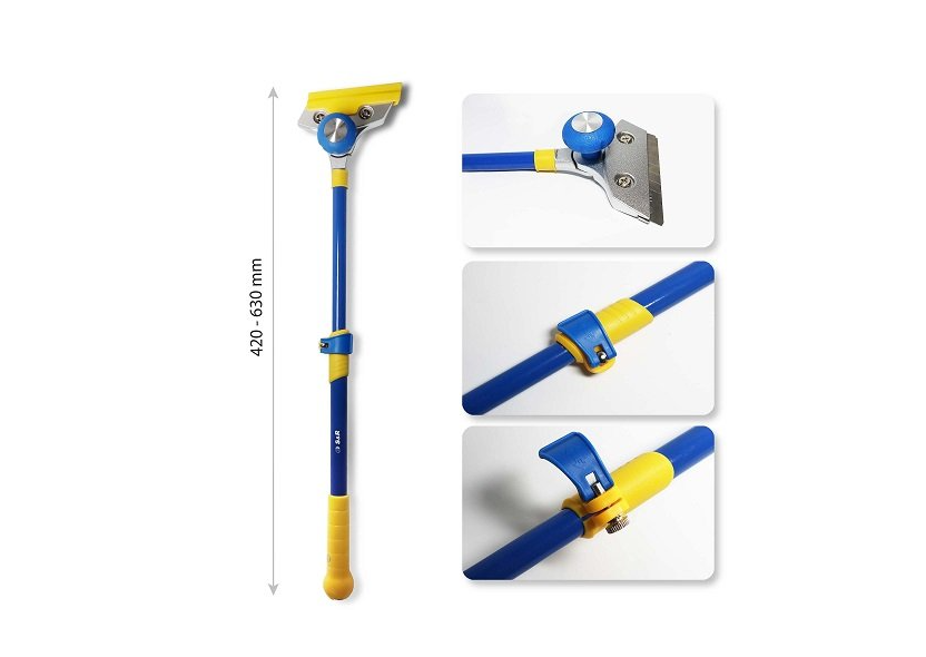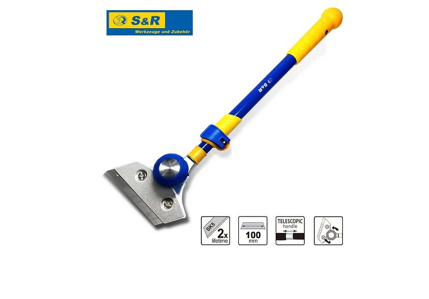 S & R 420-630 мм - скребок з телескопічною рукояткою для малярних, будівельних, ремонтних робіт. Гостре лезо зі сталі SK5 дає можливість швидко і якісно знімати покриття, зачищати поверхні, відрізати будівельні матеріали. Лезо можна повертати в потрібну сторону для поліпшення якості робіт. Зручна телескопічна рукоятка дозволяє працювати на висоті і у важкодоступних місцях. Ергономічне покриття рукоятки дає можливість працювати тривалий час без втоми. Рукоятку можна подовжити від 420-630 мм. Ширина леза 100 мм дозволяє захопити досить широку площу для зняття.Переваги та гарантія