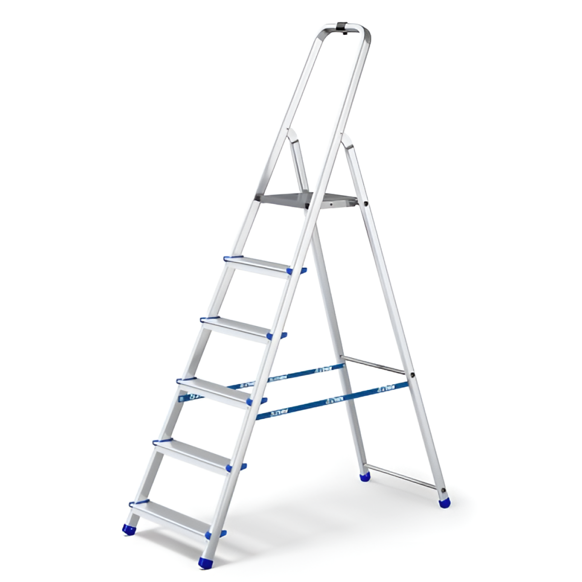 STARK SALW 506 HOME – 6-ступінчаста одностороння алюмінієва стрем'янка. Оптимальна модель для домашнього та напівпрофесійного використання. Має наступні характеристики. Виготовлена з алюмінієвого профілю завтовшки 0,8 мм. Комплектується пластиковим лотком – утримувачем, за допомогою якого можна кріпити та утримувати на висоті потрібні користувачеві інструменти під час використання драбини. Наявність пластикових накладок на ніжки, які не дряпають покриття для підлоги, перешкоджають небажаному ковзанню драбини під час її використання. Відповідає європейським стандартам якості EN 131, TUV.Переваги та гарантія
