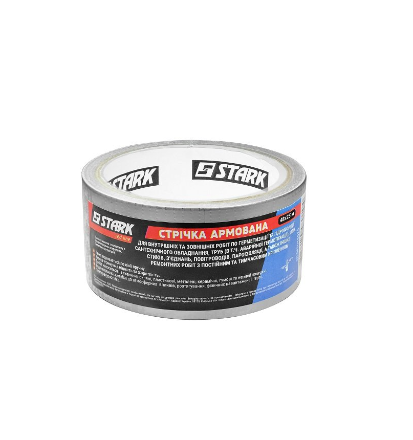 Stark 48x25 м - армована клейка стрічка одностороння призначена для ремонту, фіксації і кріплення різних поверхонь. Стрічка виготовлена на тканинній основі з поліестеру з поліетиленовим покриттям, що забезпечує їй високу міцність. Товщина 150 мкм. Стрічка Stark 48x25 м ефективно з'єднає шви, стики, забезпечить герметизацію труб, систем вентиляції і пароізоляції та ін. Стійка до сонячних променів, водонепроникна, термостійкий, завдяки чому можна використовувати поза приміщенням. Армована стрічка може забезпечити як тимчасове, так і постійне кріплення завдяки стійкості до фізичних навантажень, розтягування і тертя. Стрічка Stark 48x25 м ідеально прилипає до тканин, пластику, металу, скла, кераміки, гумі, плівці і нерівних поверхнях.Переваги та гарантія