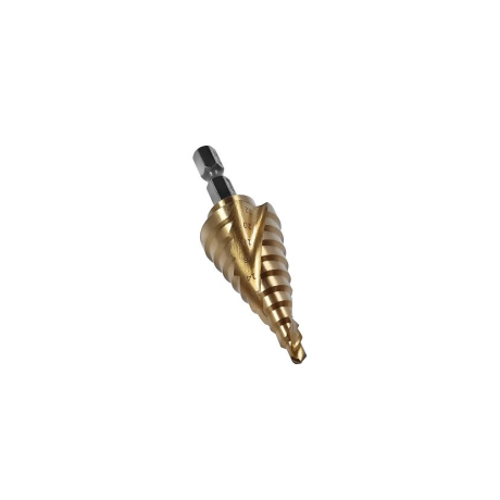S&R HSS-TiN 4-22 мм - ступінчасте свердло для точного свердління тонких металів. Обладнано спіральної канавкою для максимального контролю над свердлінням, також для ефективного відведення шламу. Виготовлено зі швидкорізальної сталі HSS для якісної роботи, а покриття TiN забезпечує високу зносостійкість інструменту. Точні, рівні краї забезпечують високу точність при свердлінні. Також відразу можна зняти фаску для акуратного отвори. Хвостовик HEX підходить для роботи з дрилями і шуруповертами.Переваги та гарантія