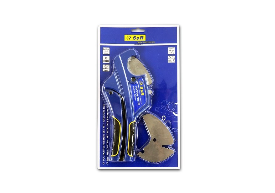 S & R PVC Pipe Cutter 42 мм - ножиці для різання ПВХ труб діаметром до 42 мм. У комплекті йде змінне лезо, яке легко замінити. Конструкція труборіза виготовлена з якісного металу, що забезпечує довгий термін служби інструменту, незважаючи на важку роботу. Завдяки храповими механізму інструментом легше працювати - швидко відрізає пластикові труби з більшою подачею зусилля. Лезо виготовлено з нержавіючої сталі HRC 54, що забезпечує інструменту довгий термін служби. Леза є можливість швидко змінити і відразу приступати до роботи. Рукоятки зручної форми, завдяки чому надійно лягають в руці. Прорезиненная накладка запобігає ковзанню в руці, ніж забезпечує безпеку користувачеві. Труборіз S & R PVC Pipe Cutter 42 мм - це якісний багатофункціональний інструмент, який не тільки розрізає пластикові труби, але і готує їх для подальшої установки.Переваги та гарантія