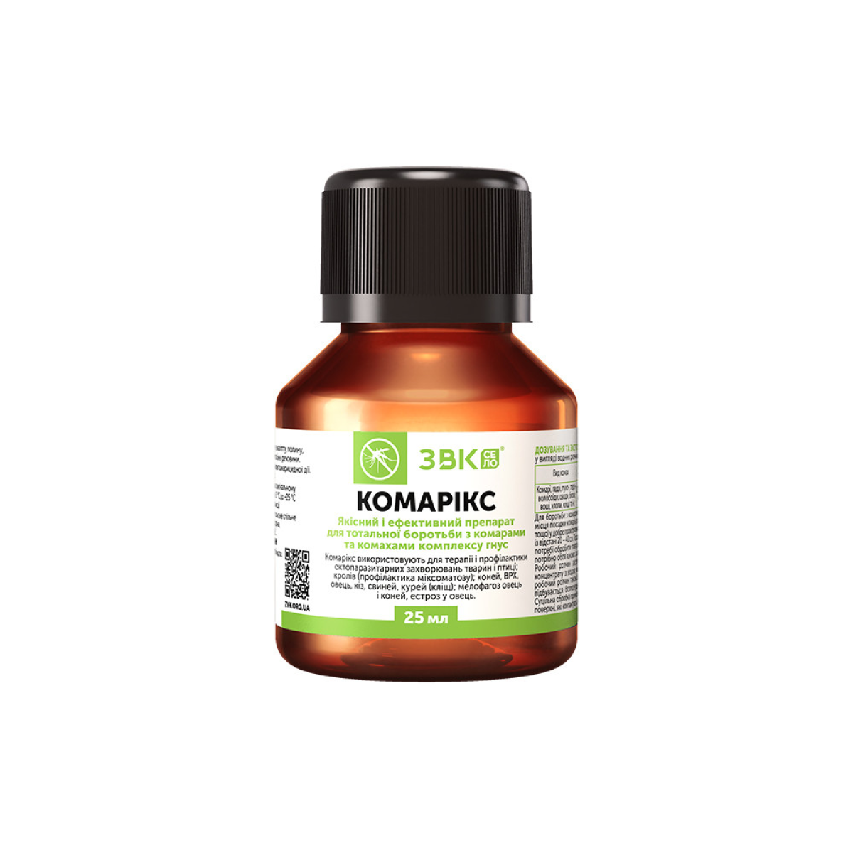 КОМАРІКС – якісний і ефективний препарат для тотальної боротьби з комарами та комахами комплексу гнус. Препарат має широкий спектр інсектоакарицидної дії. Засіб рекомендований: – згубно діє на: іксодових, гамазоїдних, саркоптоїдних, курячих. – терапія і профілактика ектопаразитарних захворювань тварин і птиці: кролів(профілактика міксоматозу), коней, ВРХ, овець, кіз, свиней, курей (кліщ); мелофагоз овець і коней, естроз. ДОЗУВАННЯ ТА ЗАСТОСУВАННЯ: Засіб застосовують у вигляді водних розчинів у концентрації: У присутності тварин та птиці 1 % – 10 мл засобу на 990 мл води У пустому приміщенні 2,5 % – 25 мл засобу на 975 мл води.Переваги та гарантія